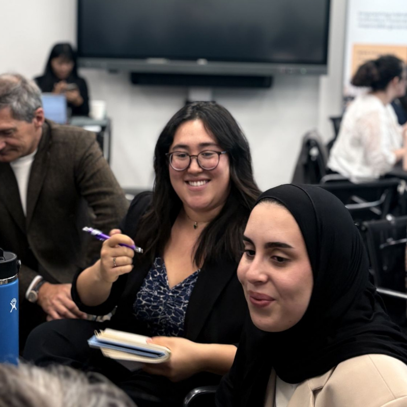 As a Senior Consultant on Digital Rights for Shared Planet, Speier drew from her research with Oxfam in Jordan on the risks and opportunities of AI in humanitarian and development work. Pictured: Speier (left) engaged in discussion on how AI can support peace while safeguarding human dignity at Globethics Geneva Peace Week.